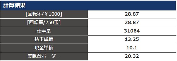 今回の実践台は体感的22回~23回ぐらいの台でしたが、結果的に回転率は28.87回となりました。