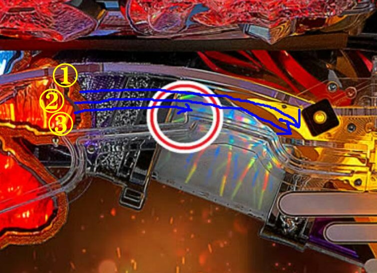 ③のひっかけ部分をまたぐ感じで、左から右にハンドルを少し戻しながら、ふわっと②の軌道を打ち、その勢いで①の全開右打ちをする感じです。