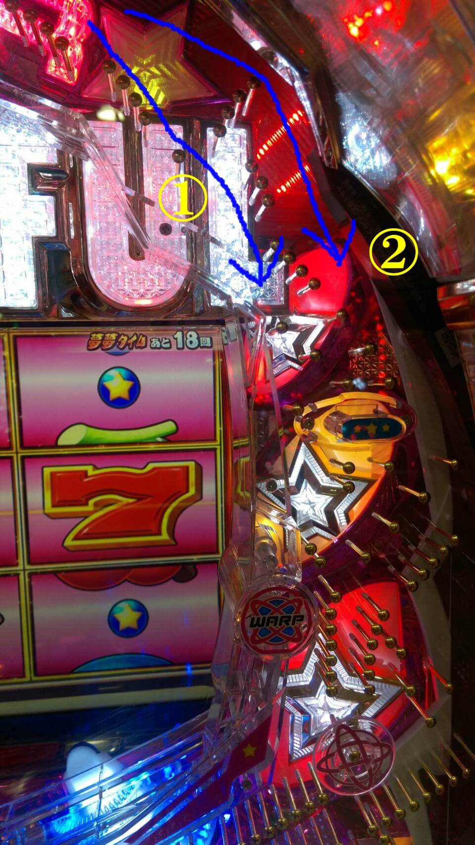 アタッカーに4個~5個入賞まで①のストロークで打ち、残り右打ち全開②。